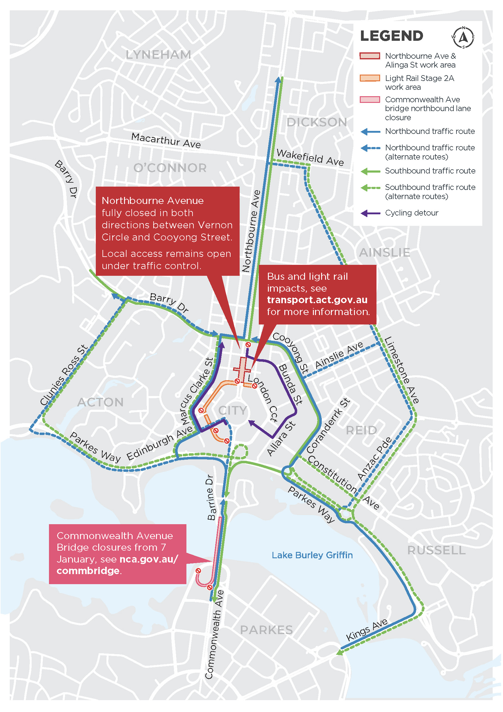 - Northbourne Avenue fully closed in both directions between Vernon Circle and Cooyong Street from 7am Sunday 4 January to 5am Monday 2 February with detours in place and traffic controls and signage in place to permit local vehicles access to driveways. See map.